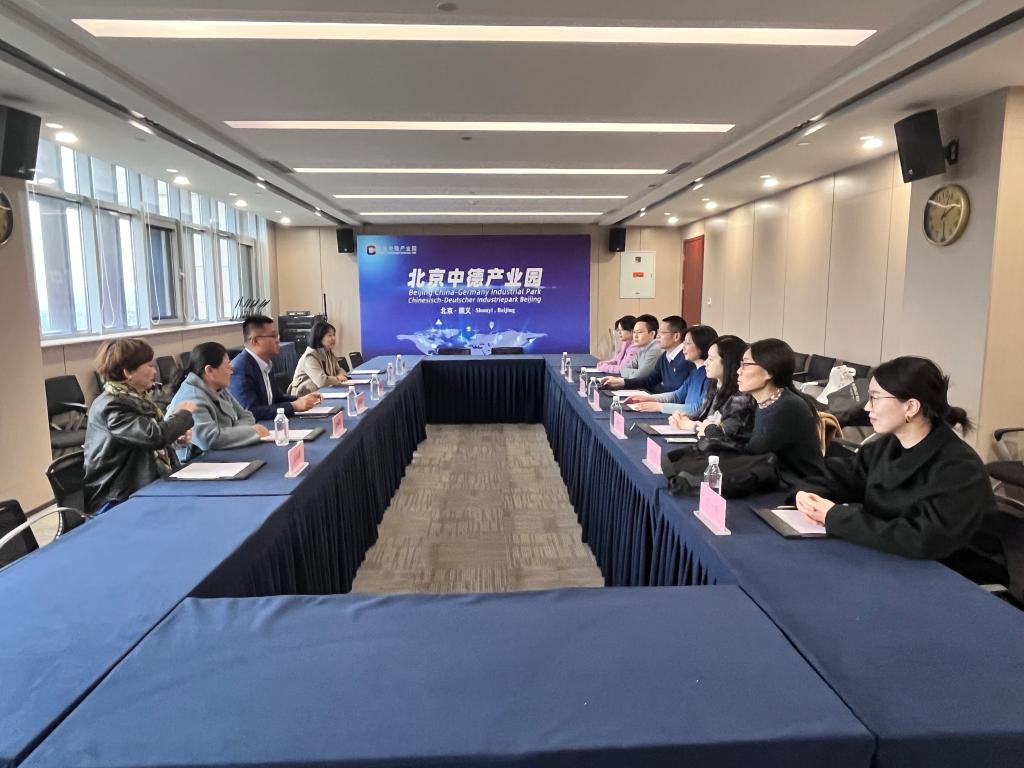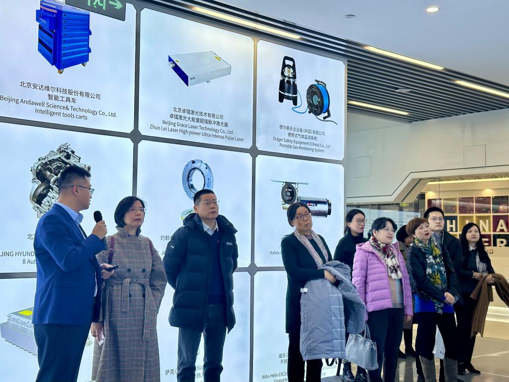 在北京中德产业园运营公司副总经理孙海龙的引导下,开云kaiyun体育教师党支部一行详细了解了产业园在搭建国家级对德合作平台、服务国家级对德合作项目、链接全国对德合作资源等方面的建设成果。北京中德产业园是国家发改委批复的国内首个以“经济技术合作”为主题的中德示范区。园区定位为“德国先进制造业的聚集地、中德隐形冠军发展的战略高地、中德交往与开放创新的重要窗口”,聚焦新能源智能汽车、智能装备、数字经济三大主导产业,和先进制造服务业支撑产业,已集聚奔驰、宝马、Ameco、博世、威乐水泵等90余家德资企业,年产值350亿元。