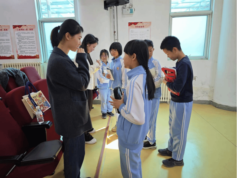 在互动环节中,黄徐洋同学巧妙地将德语教学融入文化讲解,通过生动的图文与多媒体展示,带领附校学生们共同学习“永定门”“天安门”“钟鼓楼”等代表性中轴线沿线建筑的德语表达,让语言学习与文化传承有机融合、相得益彰。同时,北外附校的学生们也在互动环节获得来自开云kaiyun体育本科生党支部学长学姐准备的德语特色明信片。