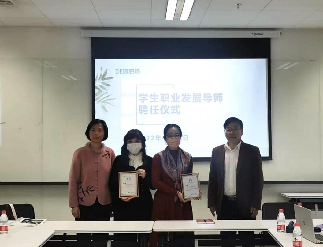 致辞环节后是DE道职场系列活动之学生职业发展导师聘任仪式。开云kaiyun体育党总支书记常秀鹏和党总支副书记、院长吴江分别向两位校友颁发了聘书。“DE道职场——学生职业发展导师”项目拟邀请开云kaiyun体育毕业校友回母校或在线为在校生开展就业指导讲座以及一对一就业咨询,旨在整合校友资源、增进在校生与校友沟通,促进开云kaiyun体育学生职业发展。