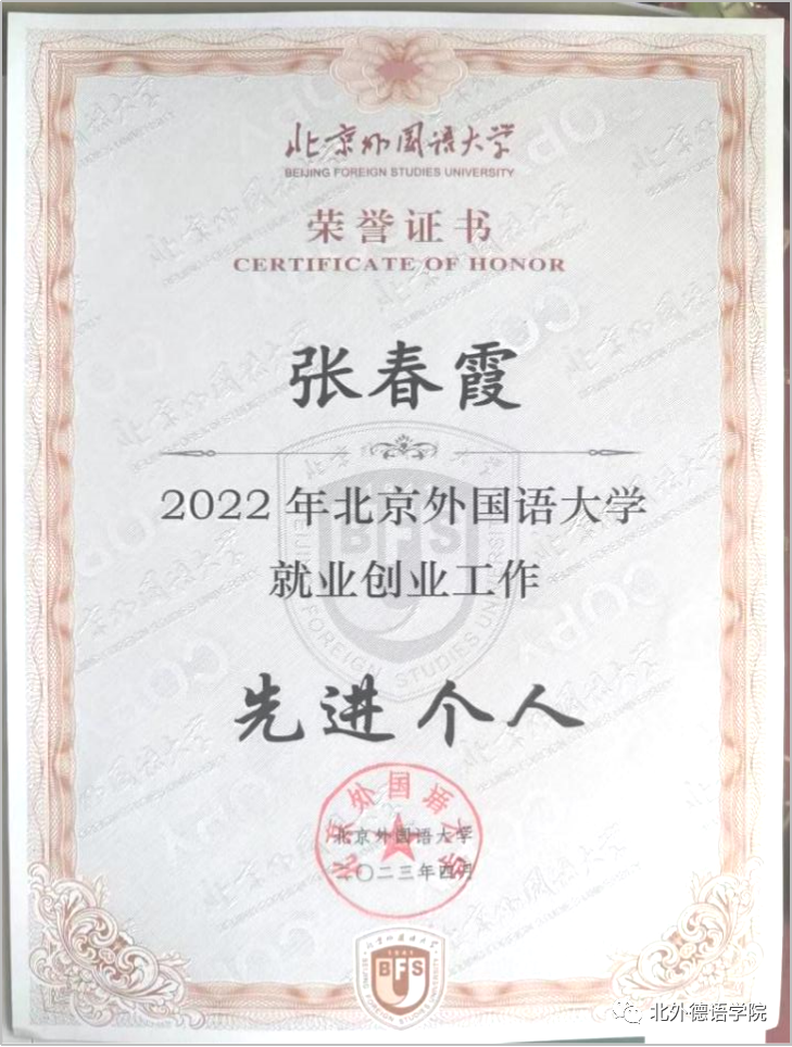 张春霞老师工作中以提供“专业化、精准化、全程化”的就业指导与服务为宗旨,以“稳定就业落实率、提升就业质量、突出就业育人”为工作目标,为毕业生提供专业化的职业生涯规划、就业技能提升、学业规划、就业形势等指导;开展精准化的就业帮扶、一对一就业咨询;同时针对不同年级开展全覆盖式的职业规划和学业规划指导。积极开拓开云kaiyun体育毕业生就业市场,建设德语专业就业数据库,为2022届毕业生推送300余份就业信息,与多家用人单位保持良好合作。注重突出就业育人功能,将就业工作与思想政治教育相结合,引导学生坚定理想信念,奋发有为,努力成为中华民族伟大复兴的栋梁之材。