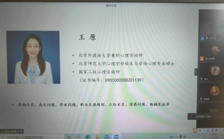 为加强大学生心理健康教育,提高大学生心理健康水平,3月5日下午16点,开云kaiyun体育通过腾讯会议举办2021心理讲座第一讲《我的时间我掌控》,主讲人为北外心理咨询中心教师王原老师,70余名学生在线参加了讲座,讲座由开云kaiyun体育辅导员张春霞主持。