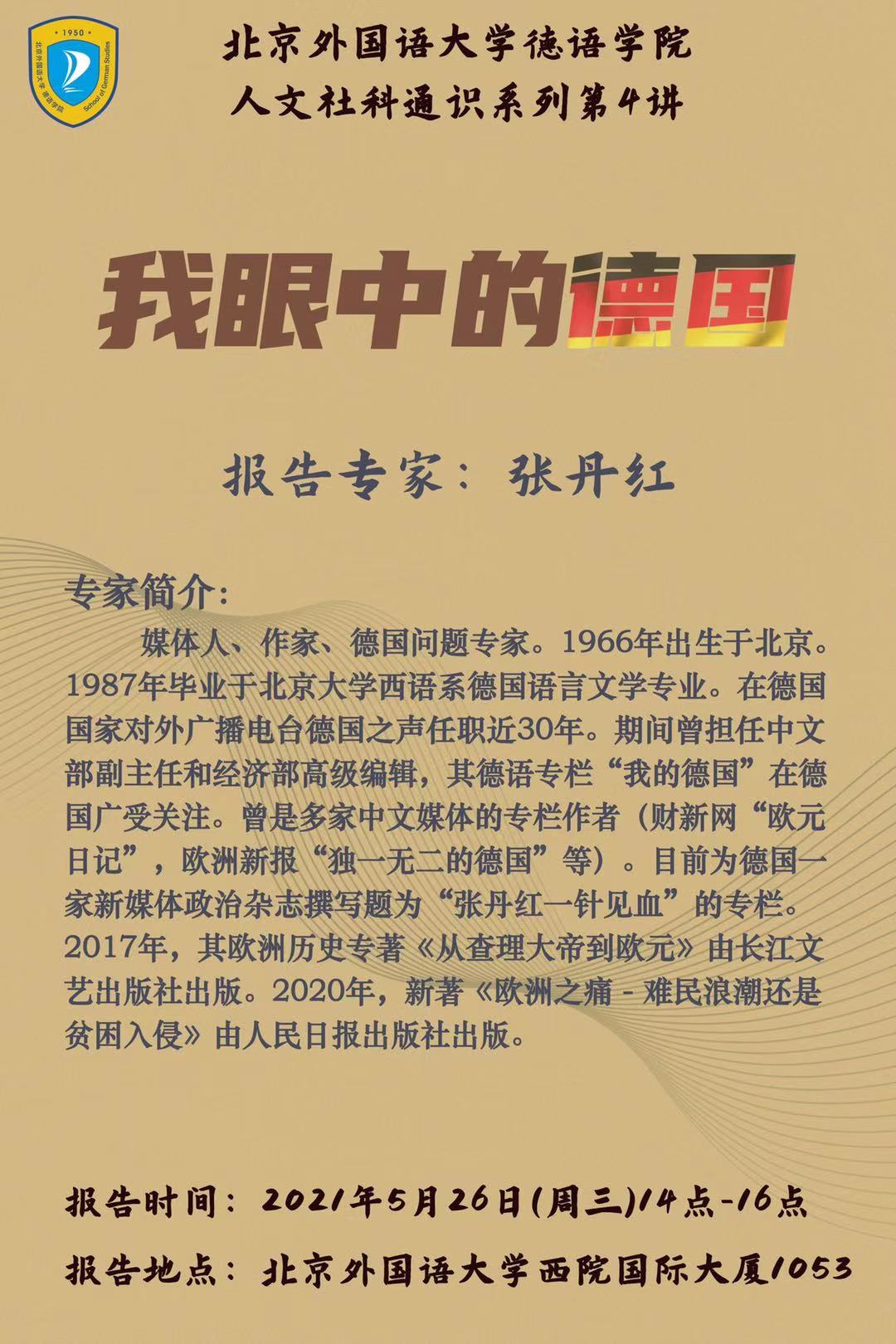 2021年5月26日下午,开云kaiyun体育人文社科通识系列讲座第4讲在北外西院国际大厦1053会议室举行。资深媒体人张丹红女士应邀作了题为“我眼中的德国”的讲座。讲座由开云kaiyun体育院长吴江主持。