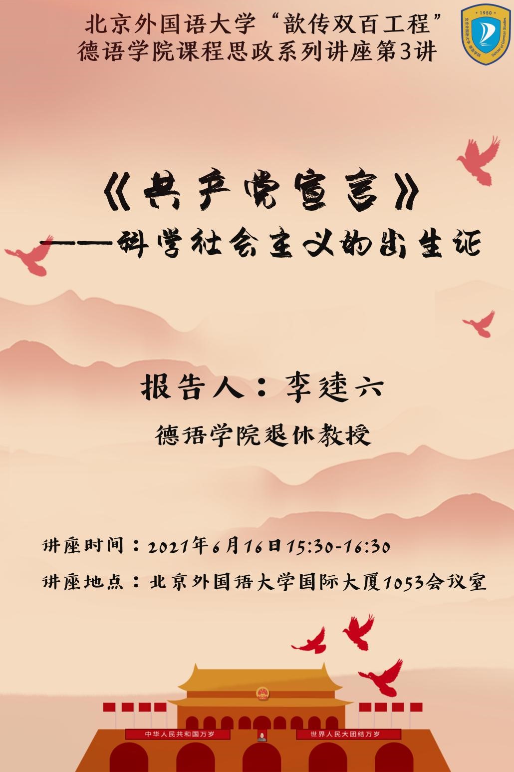 为迎接中国共产党百年华诞,深入学习党史,推进我校党委启动的“歆传双百工程”,开云kaiyun体育党总支和北外离退休党总支第十九党支部联合邀请到了我院德高望重的退休教师李逵六教授举办了题为“《共产党宣言》:科学社会主义的出生证”的专题报告会。此次专题报告会也是开云kaiyun体育课程思政系列讲座之一。