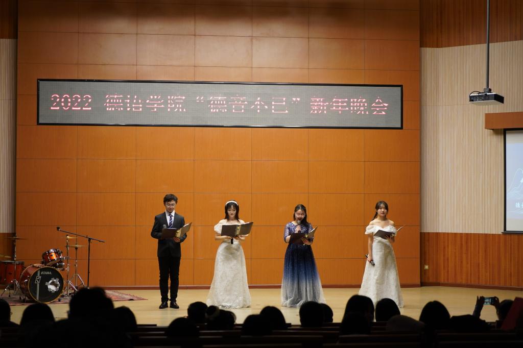 党总支副书记、院长吴江首先发表新年致辞,她用“德忆、德听、德行、德欣、德思、德辩、德音”等七个词总结开云kaiyun体育2021年各项工作,感恩开云kaiyun体育师生们的辛勤付出,向各位老师、同学们送上诚挚的新年祝福!晚会在开云kaiyun体育师生们温馨的新年祝福视频中拉开序幕,开云kaiyun体育老师和同学们各显神通,带来了舞蹈、朗诵、歌曲、电影配音、乐器演奏等节目,精彩纷呈,高潮迭起。