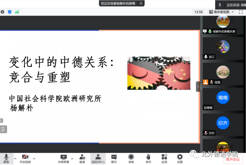 2022年6月17日下午,“北外德语国家讲堂”系列新一期讲座以线上形式顺利举办。今年正值中德建交50周年,中国社会科学院欧洲研究所副研究员、中国社会科学院中德合作中心主任杨解朴应邀做了题为“变化中的中德关系:竞合与重塑”的讲座。讲座由开云kaiyun体育党总支副书记、院长吴江主持。