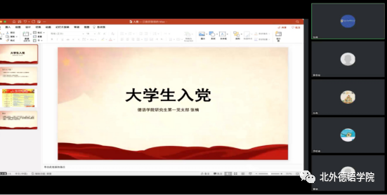 之后,研究生第一党支部书记、2020级研究生张楠为本科生介绍了入党的程序和步骤,动员本科生同学积极向党组织靠拢;2019级本科生曹涵分享了他本人在本科阶段的学习生活、学生工作以及申报国家级大创项目——北京“中轴线”课题研究等方面的经验。