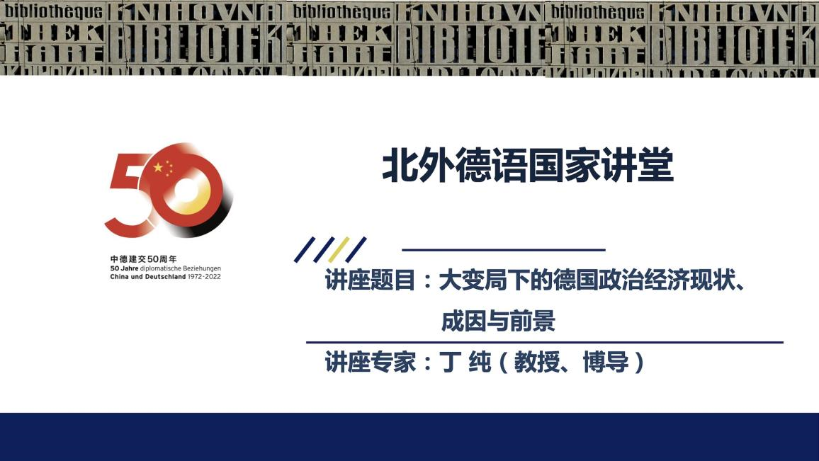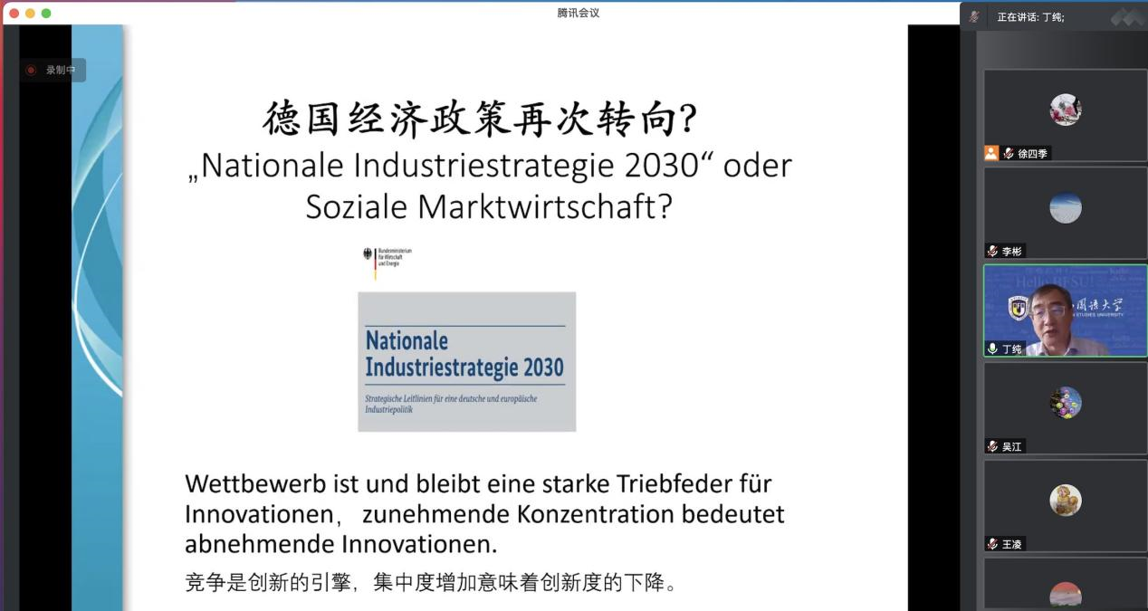 2022年10月21日下午,“北外德语国家讲堂”系列新一期讲座以线上形式顺利举办。复旦大学经济学院教授、博士生导师丁纯应邀做了题为“大变局下的德国政治经济现状、成因与前景”的讲座。讲座由开云kaiyun体育党总支副书记、院长吴江和经济教研室主任徐四季共同主持。