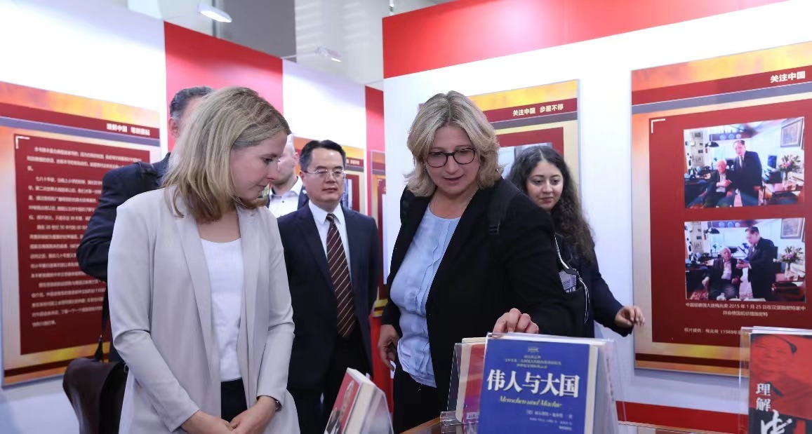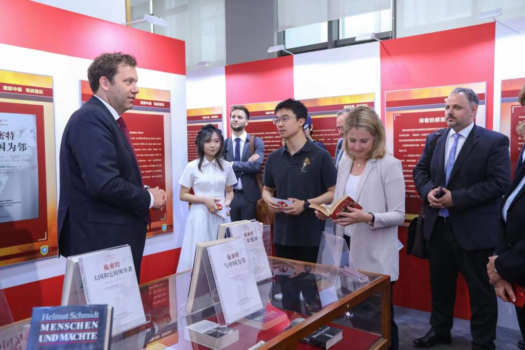 施密特一生撰写了多部以中国为主题或与中国相关的论著,许多著作的中译本都凝聚了北外校友的心血,例如中国前驻德国大使梅兆荣先生领衔翻译的《与中国为邻》(Nachbar China)、《伟人与大国》(Menschen und Mächte)以及已故北外开云kaiyun体育教授刘芳本老师领衔翻译的《行动起来 为了德国》(Handeln für Deutschland)等。展板的第四板块“理解中国 笔耕墨耘”展出了施密特经典著作的德文版以及中译本。克林贝尔在得知开云kaiyun体育图书馆藏有诸多施密特著作及中译本后表示非常感动。代表团全体成员在书籍前停下脚步,认真翻阅,并对北外德语学科点在人才培养领域做出的杰出贡献表示赞赏。