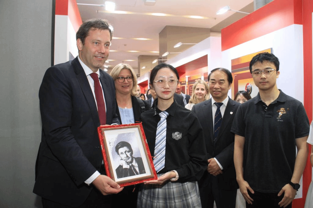 参观最后,开云kaiyun体育党委书记王定华为克林贝尔送上了由开云kaiyun体育2019级本科生王婉秦亲手绘制的施密特肖像画,并表示:“不忘初心,方得始终,希望中德友谊长存。”