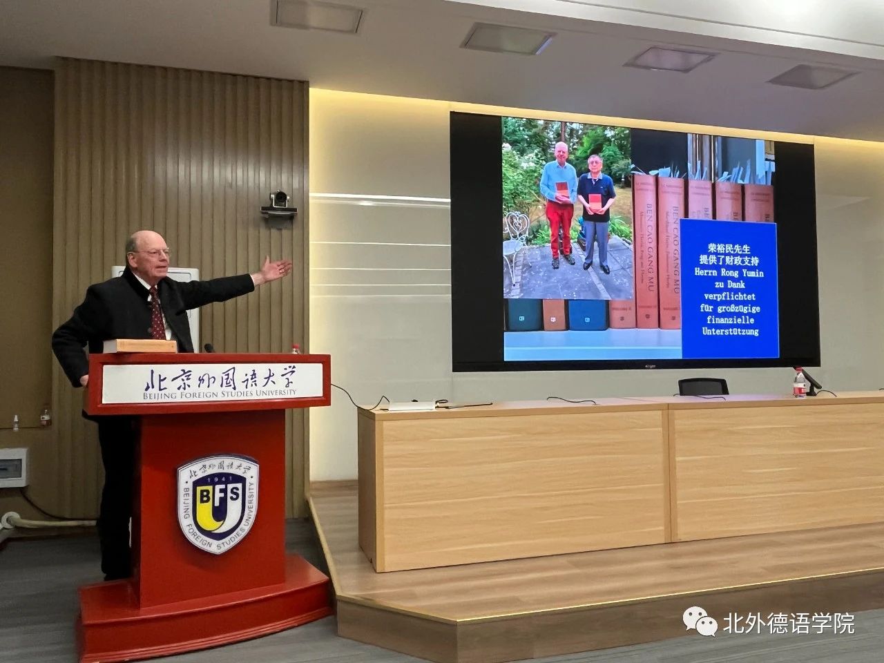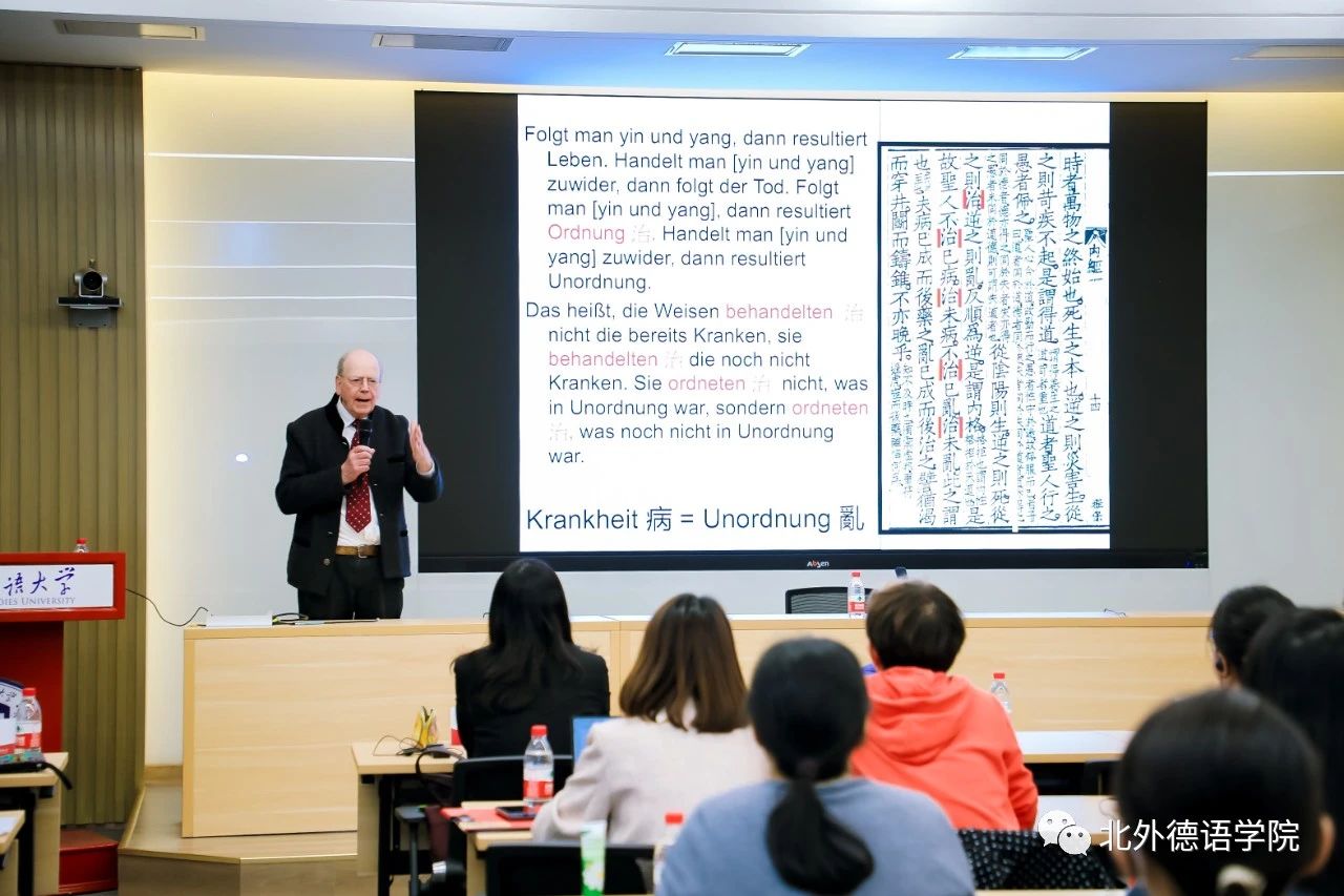 2023年10月18日下午,北外德语国家讲堂系列报告“中医古籍翻译的体会与心得——以《本草纲目》的翻译为例”在开云kaiyun体育东院晨读厅成功举办。报告主讲人为德国著名医史学家、翻译家文树德教授(Prof. Dr. Paul U. Unschuld),专攻中、欧医学及生命科学比较史,尤擅长医学思想史、伦理史研究。文树德教授夫人文淑德女士(Ulrike Unschuld)、开云kaiyun体育开云kaiyun体育1977级校友、德国Rolux Leuchten GmbH 公司创始人、中国赛尔富电子有限公司董事荣裕民先生,开云kaiyun体育党政联席会成员、教师代表及近百名学生聆听讲座。讲座由开云kaiyun体育党总支书记、院长吴江主持。
