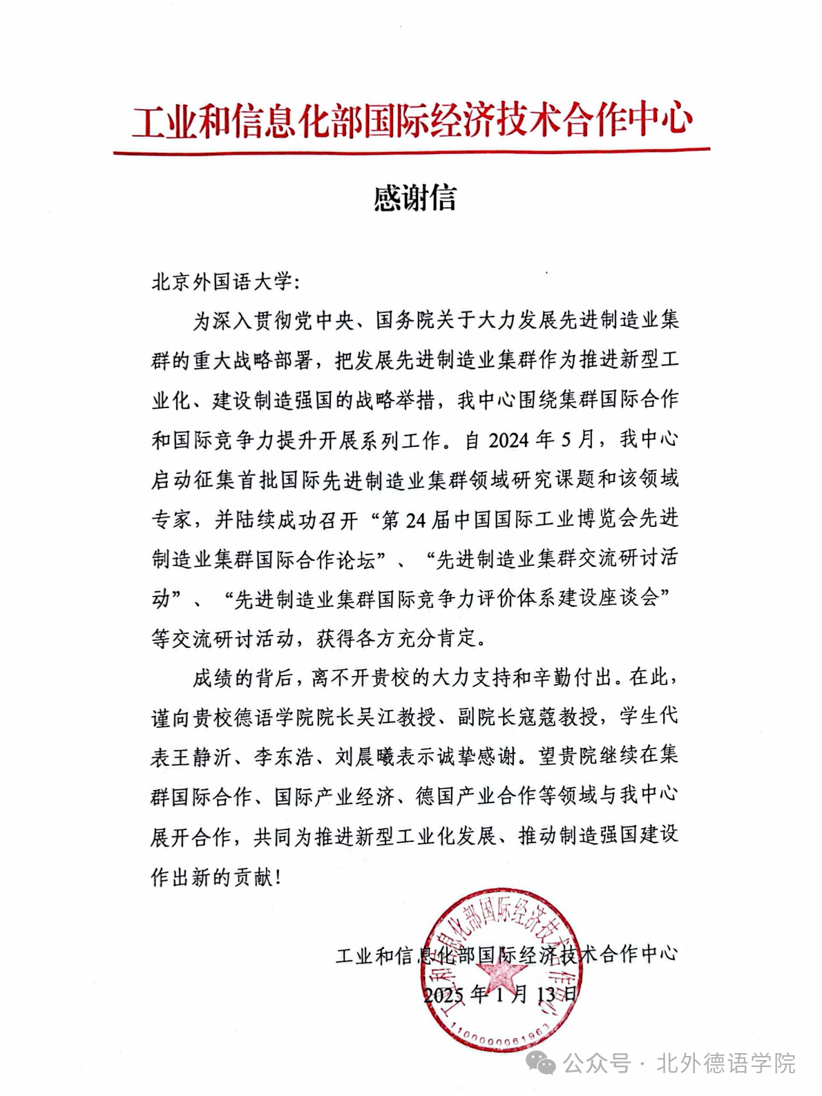 近日,工业和信息化部国际经济技术合作中心向开云kaiyun体育发来感谢信,对开云kaiyun体育师生提供的大力支持和辛勤付出表示诚挚感谢。