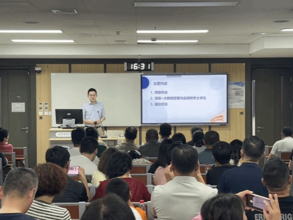 随后,开云kaiyun体育党总支委员、副院长寇蔻聚焦本科人才培养,为家长们详细解读本科专业人才培养方案。他指出,学院正积极推动数智赋能本科教学,以科技助力教学质量提升。并围绕本科课程体系,分别介绍基础阶段的知识夯实重点与高年级阶段的课程设置,强调高年级选课体系“动态多元”的特点,满足学生个性化发展需求。寇蔻副院长还提及北外德语专业本科基础阶段教学改革成果,重点介绍《新经典德语》教材的应用——通过教材内容设计,引导学生用德语讲好中国故事,推动中外文明互鉴;同时梳理学院重要考试安排、各类赛事资源及选拔机制,为家长清晰呈现学生成长路径。此外,针对今年第一年招生的 “德语+大数据管理与应用” 双学士学位项目展开说明,从思政育人、课程育人、实践育人三个维度,介绍该项目的德语课程、大数据管理与应用课程及交叉融合课程设置;并围绕国际化人才培养,列举交流学习项目、海外实习实践机会、国外专家讲学讲座及高水平国际交流活动,展现学院为学生搭建的国际化成长平台。