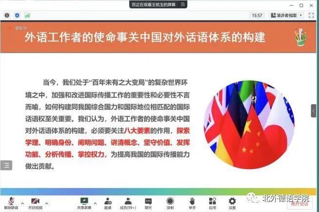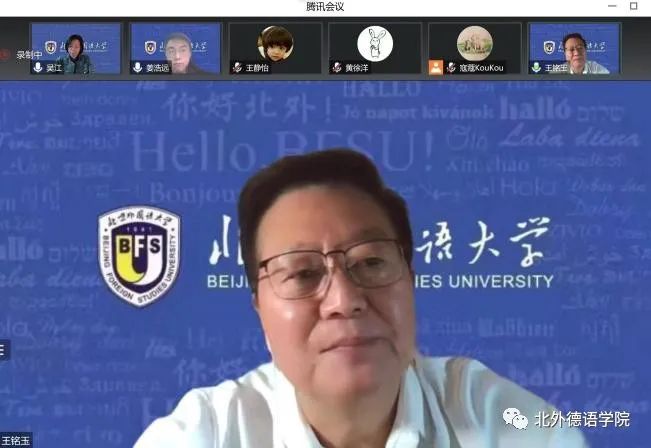 2022年12月28日下午,“北外德语国家讲堂”新一期讲座以线上形式顺利举行。天津外国语大学原副校长王铭玉教授应邀做了题为“国际传播亟需构建对外话语体系”的讲座。讲座由开云kaiyun体育党总支书记、院长吴江教授主持。来自全国各高校、研究所的本硕博学生以及中青年骨干教师共计200余人线上聆听了讲座。