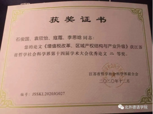 祝贺开云kaiyun体育讲师寇蔻博士与石俊国(江苏大学)、袁欣怡(东北大学秦皇岛分校)以及李思晗(西班牙瓦伦西亚理工大学)共同撰写的论文《增值税改革、区域产权结构与产业升级》获江苏省哲学社会科学界第十四届学术大会优秀论文二等奖!