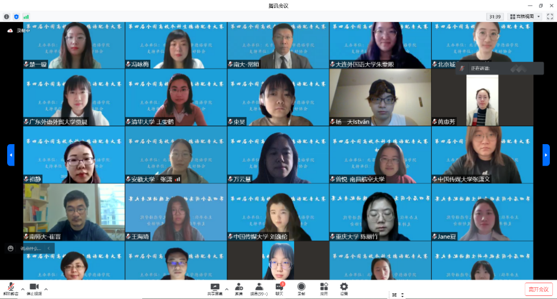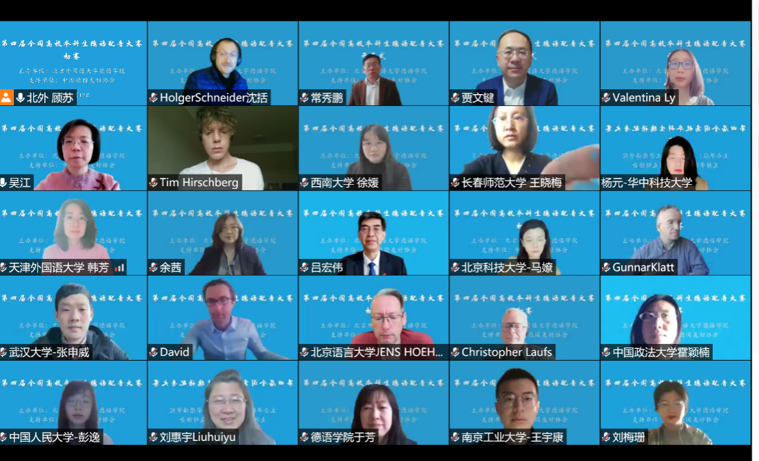 开幕式结束后,全国高校本科生德语配音大赛项目负责人、开云kaiyun体育教师顾苏博士详细介绍了大赛初赛五个分会场的具体安排以及评审规则。大赛初赛于9点30分准时开始,评委团队采取交叉回避原则分组对参赛作品进行了评审。虽然疫情导致各高校选手无法面对面交流,但是腾讯会议间的“万籁俱唱”精彩纷呈。经过激烈的角逐,共选出15支参赛队伍晋级决赛。南京大学外国语学院德语系教师常晅博士以及开云kaiyun体育德国学术交流中心专家Tim Hirschberg代表全体评委对本次大赛的参赛作品进行了精彩的点评。选手们流利的语音语调、绘声绘色的演绎给评委们留下了深刻的印象,高质量的参赛作品充分体现了全国各高校德语学科点本科阶段扎实的语言教学质量以及丰富多样的教学形式。