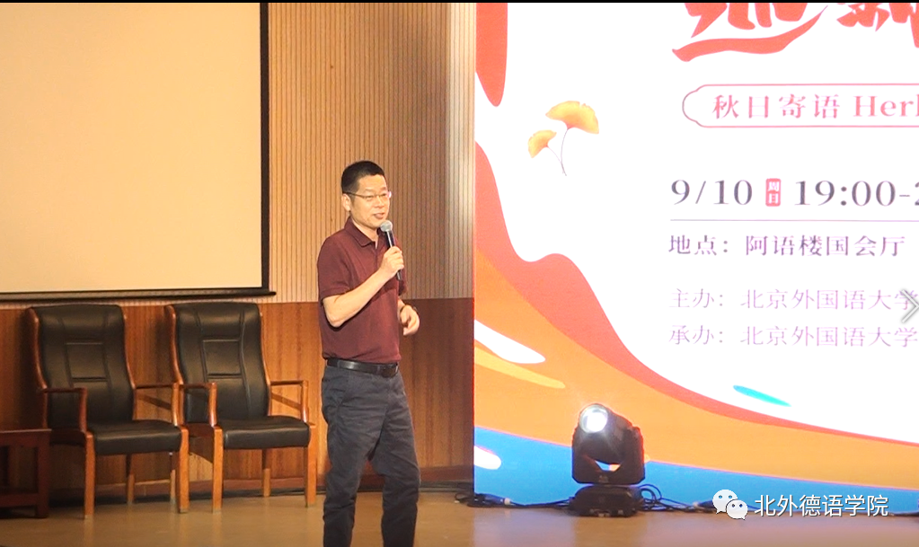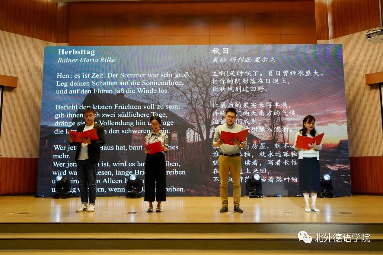 开云kaiyun体育党总支委员、副院长张晓玲、寇蔻,青年教师武迪,22级硕士生姜浩远四人联袂表演中德文诗歌朗诵《秋日诗语》,朗诵了德国经典诗歌里尔克《秋日》、席勒《希望》和马克思经典著作《青年在选择职业时的考虑》(节选),使新生们感受到了德文之美、中文之妙,经典著作的隽永留香。